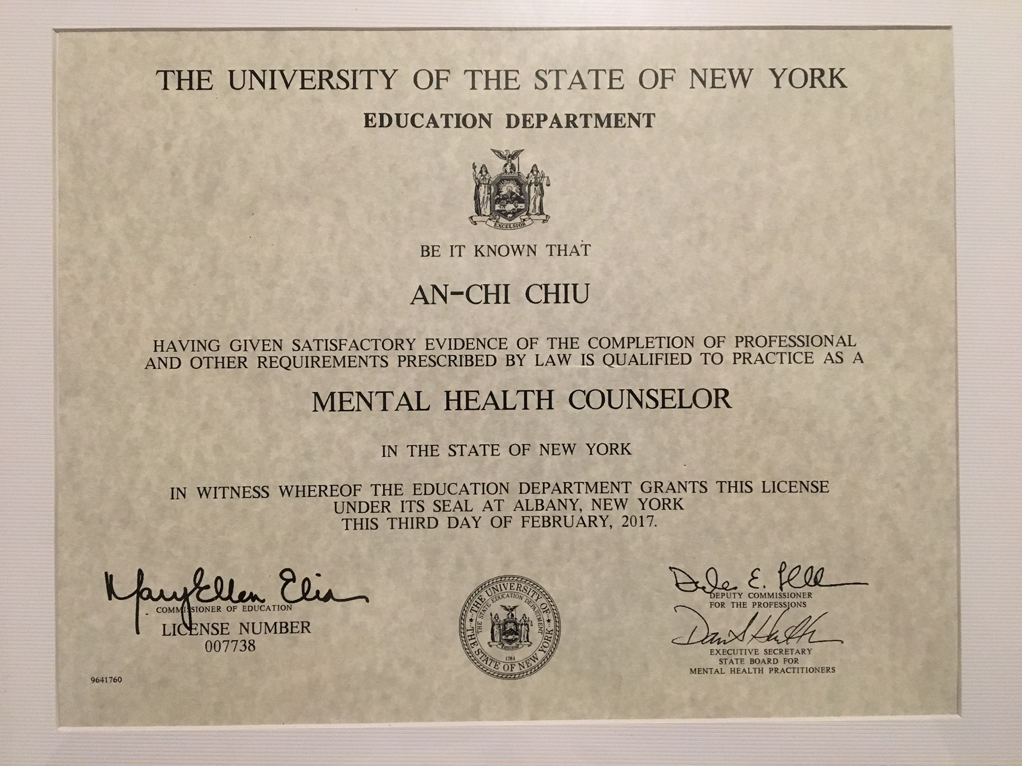 I am a Licensed Mental Health Counselor (LMHC) in the state of New York. Specializing in depression, anxiety, psychotic symptoms, chronic mental illness, suicide crisis, grief, as well as issues related to life transitions, self-esteem, childhood trauma, family relationship, interpersonal difficulty. It has been over ten years since I stepped in psychology field. School, hospital, community, I have provided services in different types of setting and been interested in working with diverse population. From the east to the west of the world, I always looking for possibilities with human being.